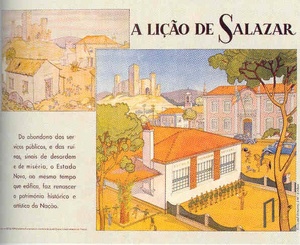 Estes cartazes foram distribuídos por todas as escolas primárias do país numa estratégia propagandística de glorificar a obra da disciplina e da ordem face à desordem e atraso próprios das fraquezas dos regimes democráticos.
